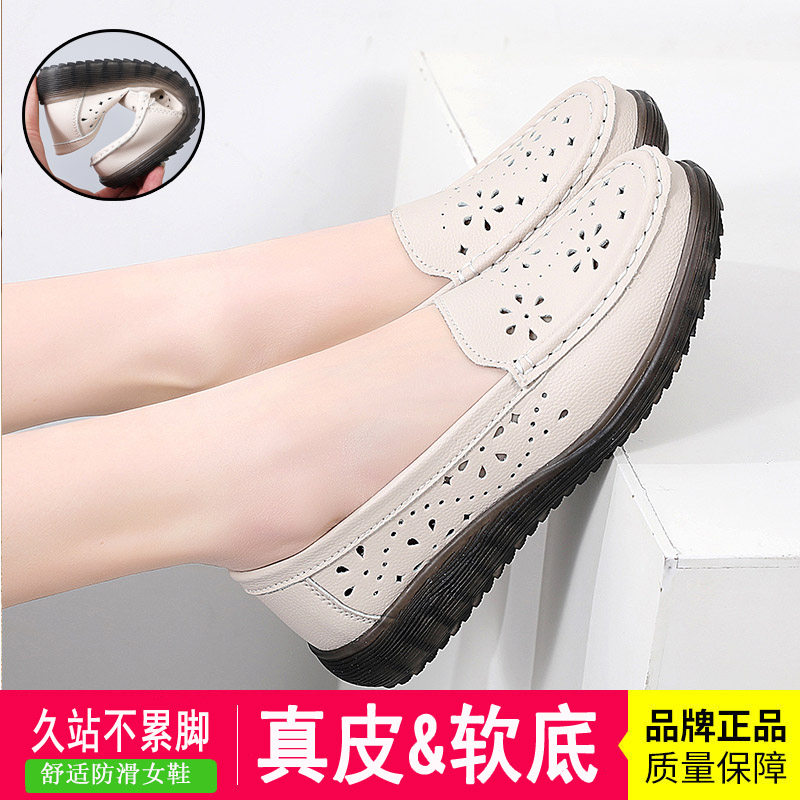 真皮豆豆鞋夏季2024新款平底浅口妈妈鞋牛筋底软底镂空软皮中老年