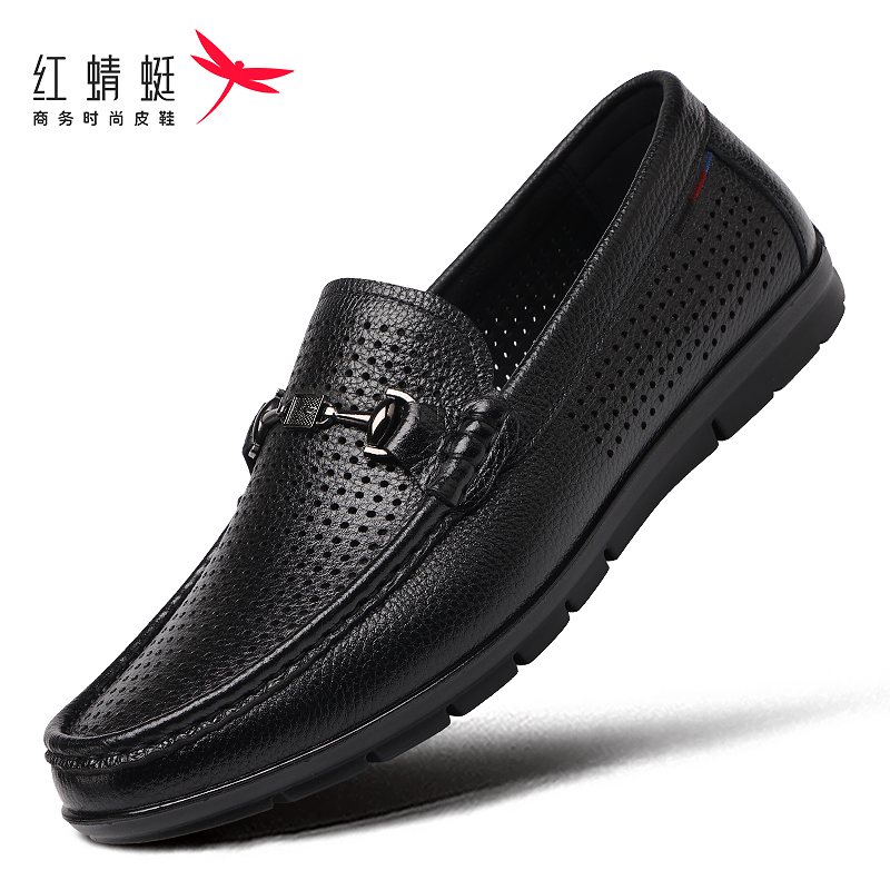 红蜻蜓男鞋懒人豆豆鞋夏季大孔透气舒适驾车一脚蹬真皮休闲皮鞋男