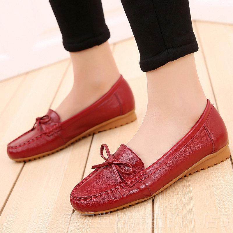 春秋女鞋真皮软底平底单鞋浅口舒适妈妈鞋豆豆鞋夏季大码红色皮鞋