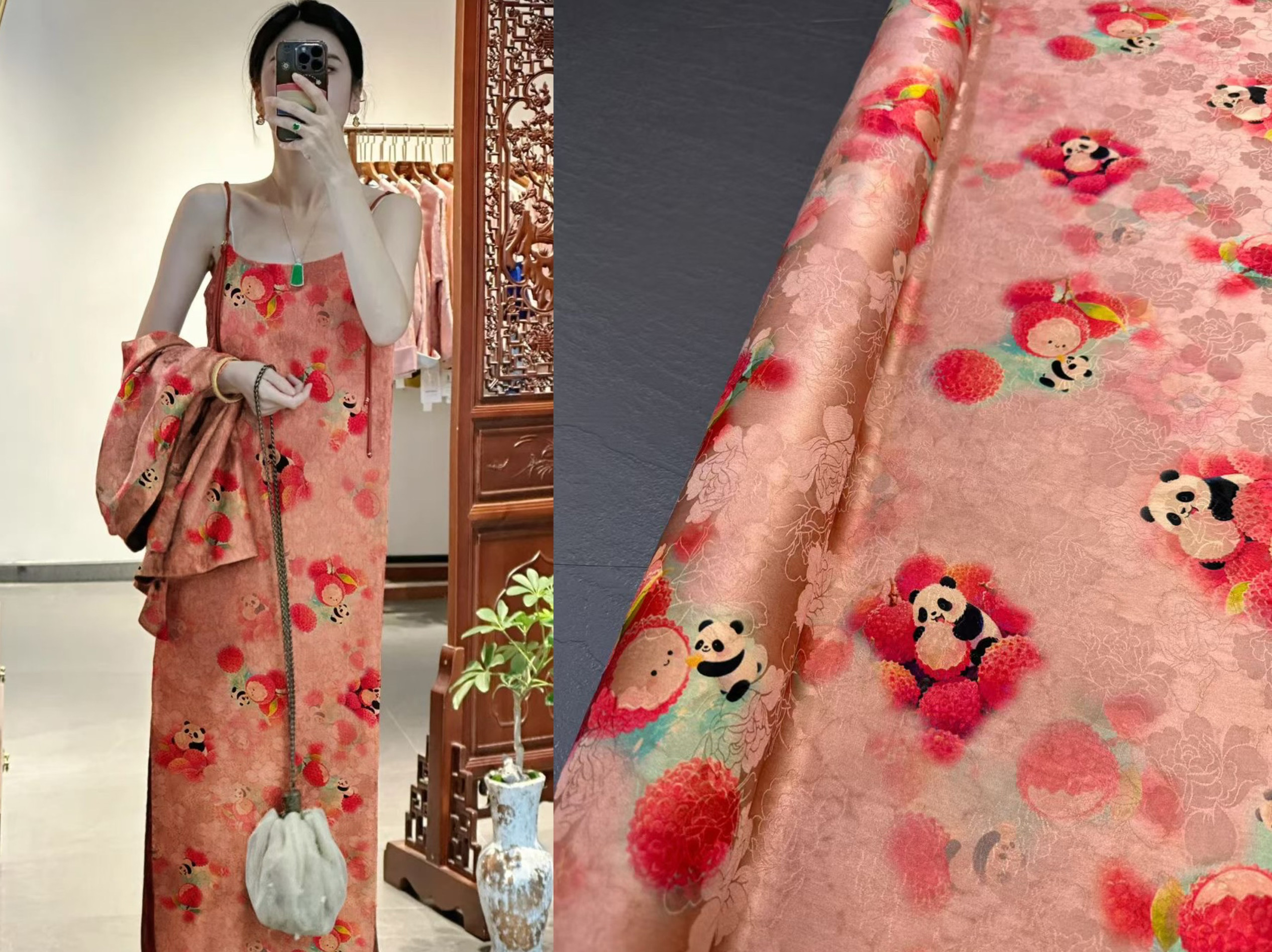 荔枝熊猫百分百桑蚕丝花罗红云纱旗袍连衣裙衬衫童装外套真丝布料