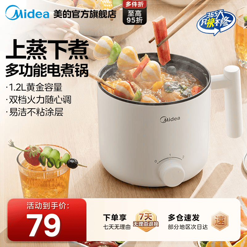 美的电煮锅宿舍学生家用小型煮面锅小电火锅多功能蒸煮一体蒸笼锅
