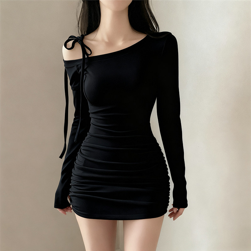 韩版斜肩绑带连衣裙女夏季新款设计感半露肩褶皱显瘦短款包臀短裙