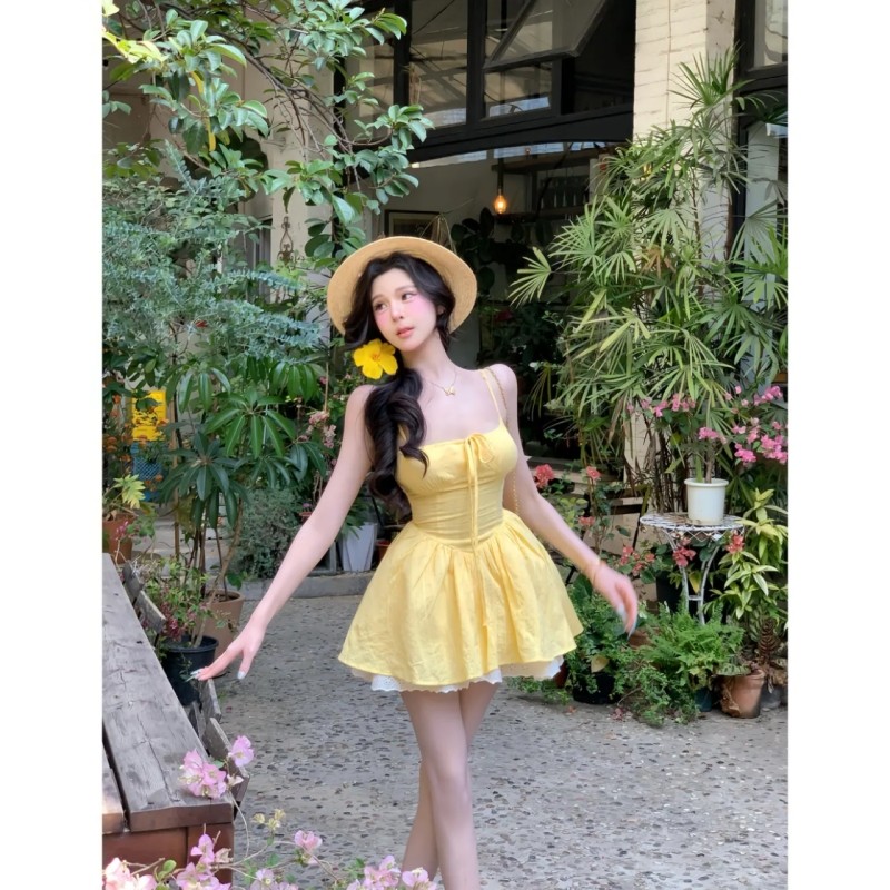 木耳边吊带连衣裙女2025夏季新款韩版收腰甜美初恋蓬蓬裙短裙裙子