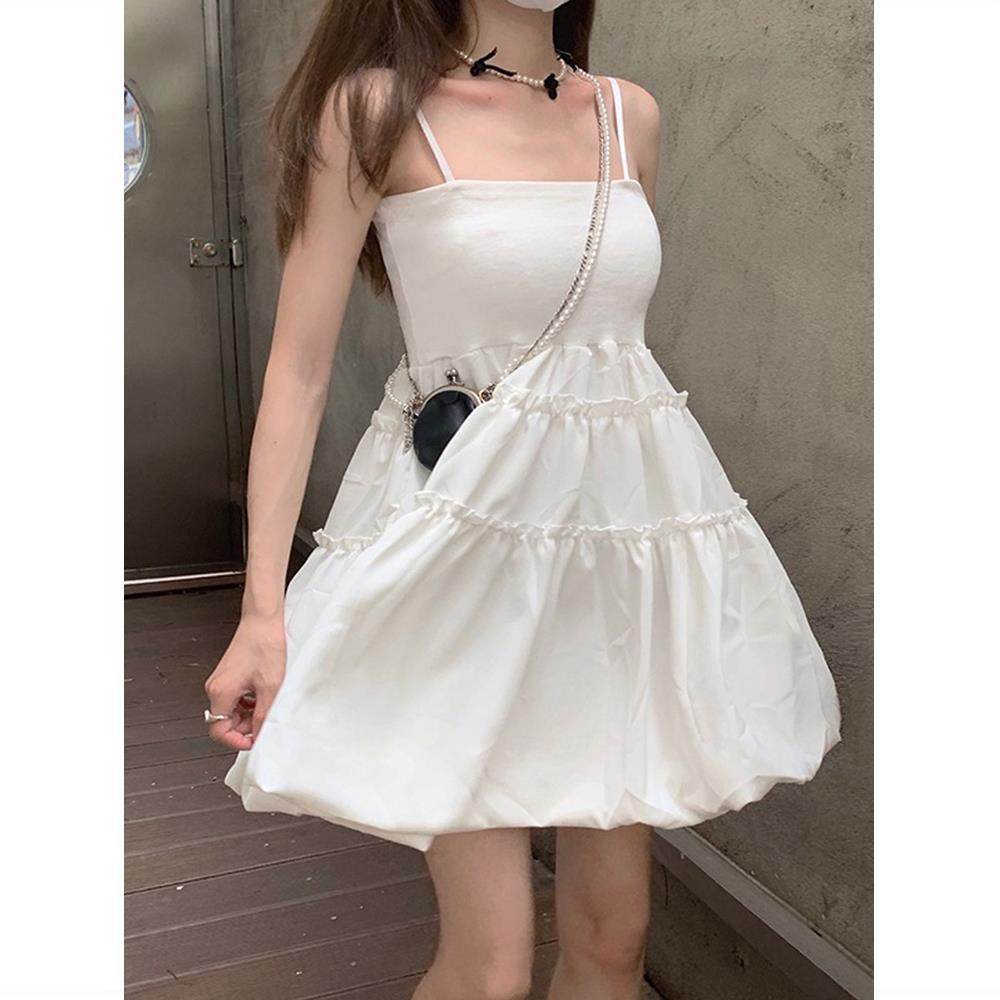 韩版白色系古着气质收腰小个子吊带连衣裙夏季纯欲辣妹高腰短裙子