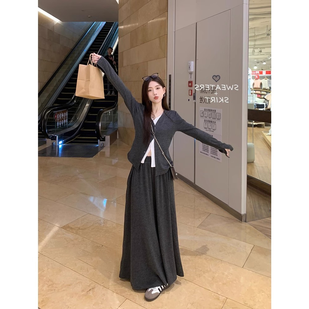 撞色假两件拼接V领长袖针织衫显瘦高腰长裙半身裙女早秋休闲套装
