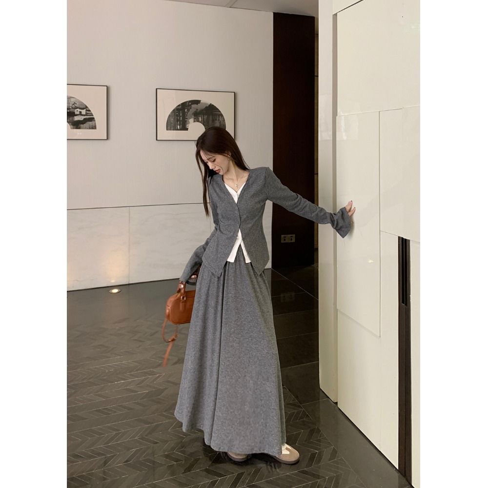 MJ STYLE灰色百褶西装裙女春秋半身裙高腰休闲大摆a字过膝中长裙