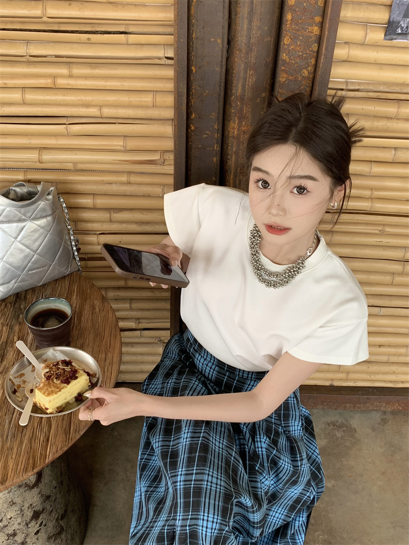 XIAOANQI复古垂感格子撞色显瘦韩版高腰长裙半身裙百搭纯棉白t恤
