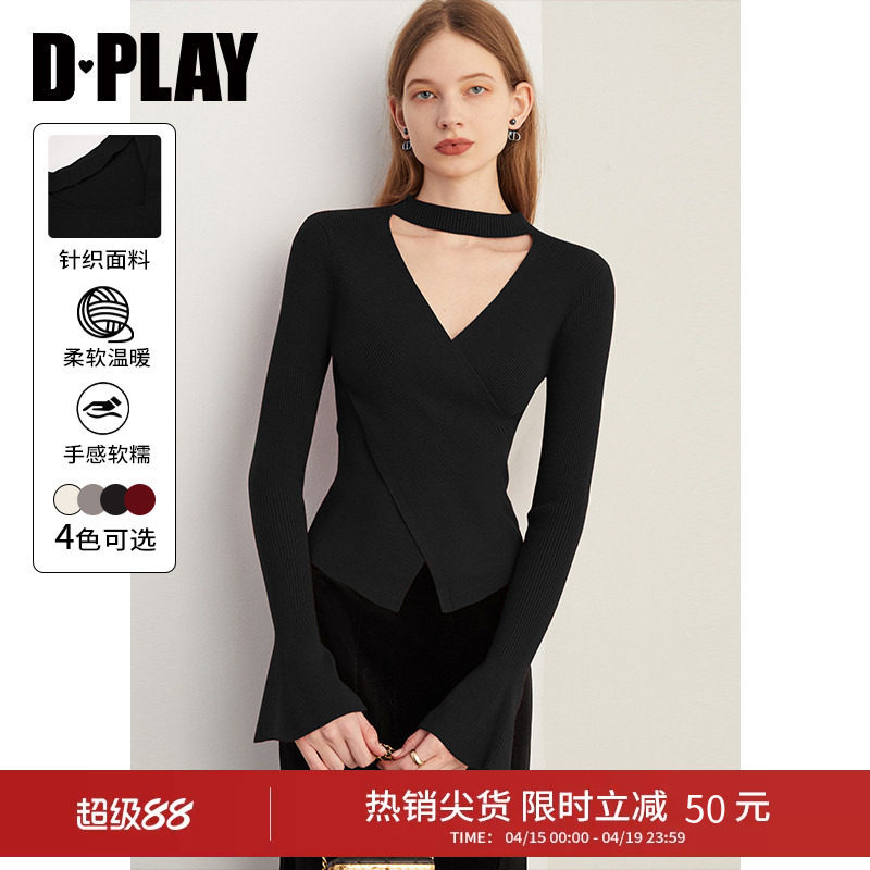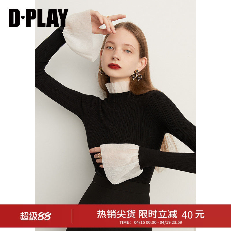 DPLAY法式优雅黑色喇叭袖半高领镂空针织套头毛衣打底衫2026年春