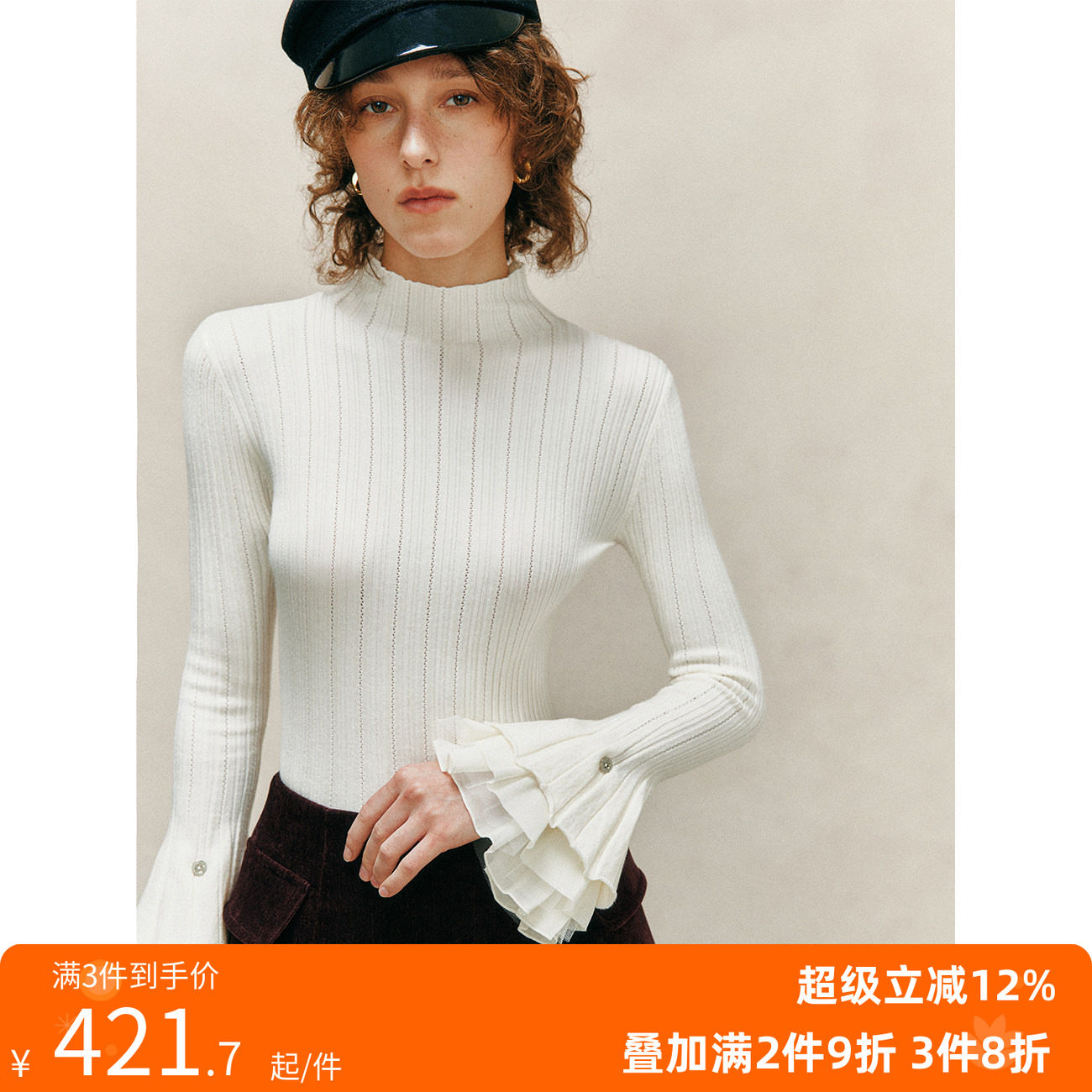 FIVE PLUS针织衫女打底衫木耳边半高领喇叭袖甜美修身立领上衣