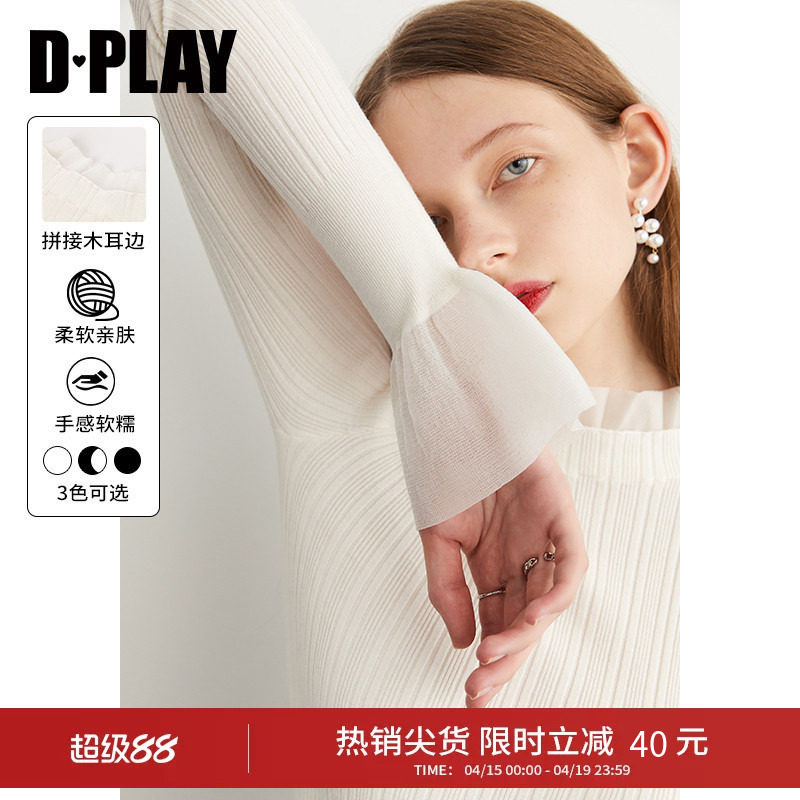 DPLAY春季法式喇叭袖黑色毛衣女木耳边上衣修身内搭针织衫打底衫