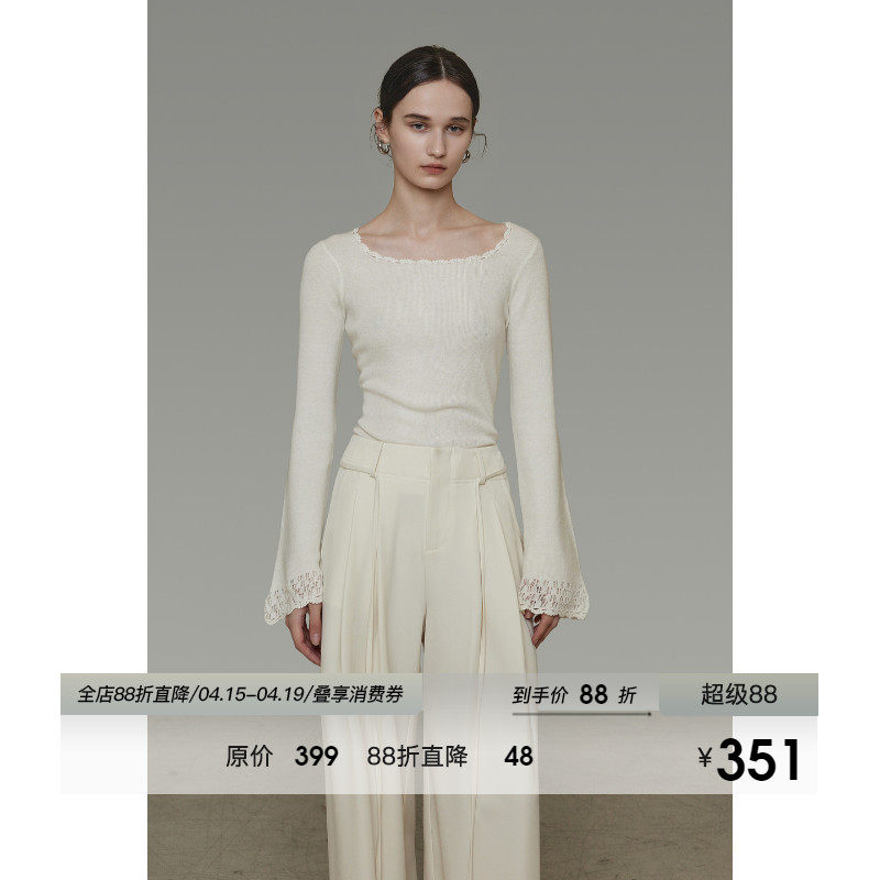 ByYou 秋季新款软糯蕾丝花边白色打底针织衫女显瘦喇叭袖内搭上衣