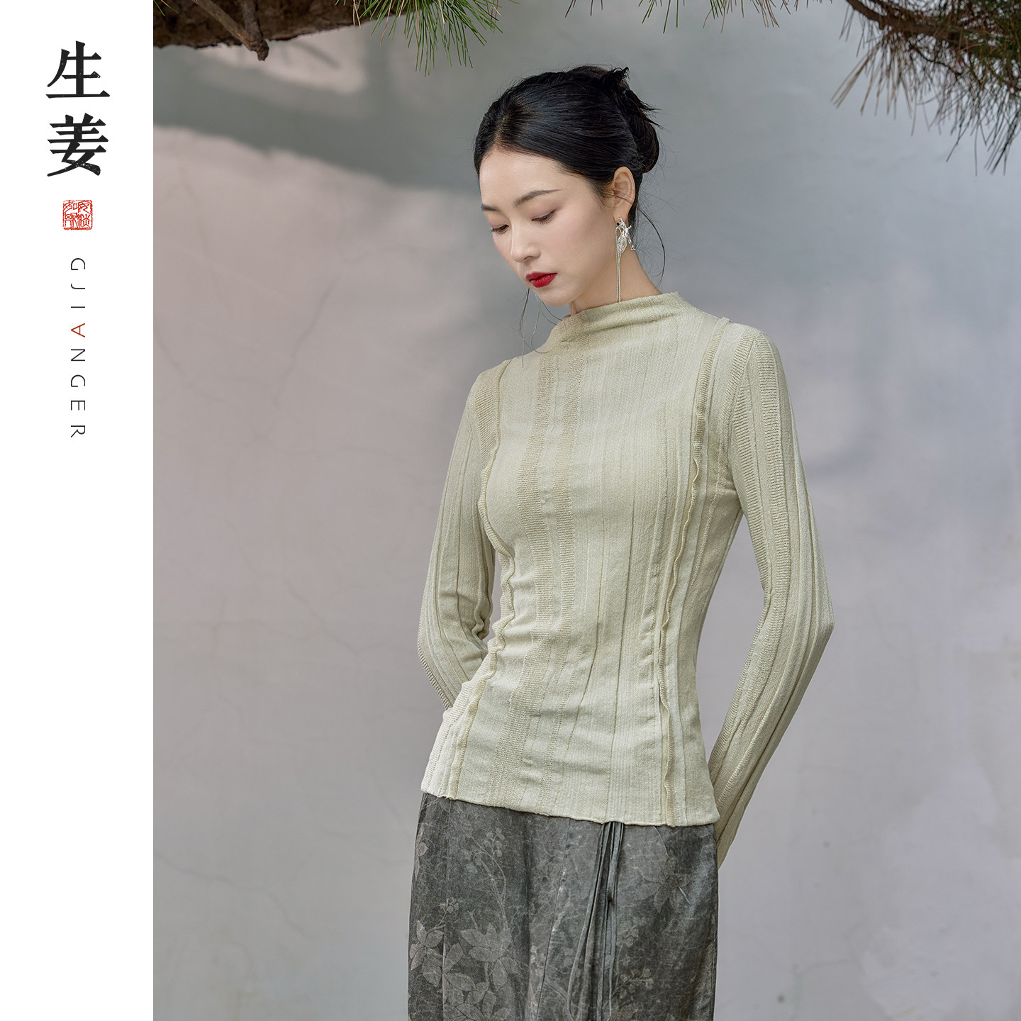 生姜 风徊新中式原创2026春新品微喇叭袖修身打底针织衫31546303A