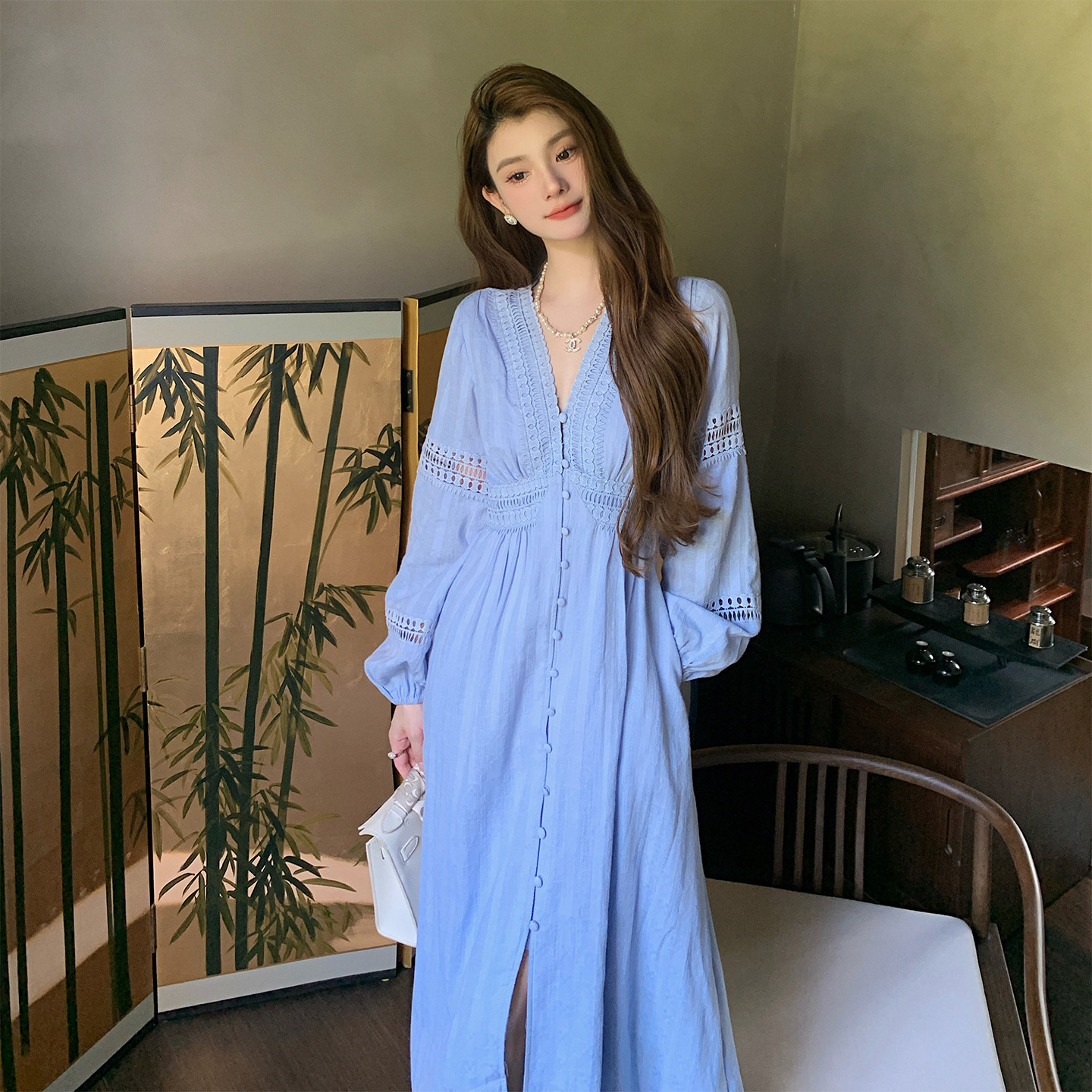 AM NANA法式气质V领长袖连衣裙女设计感蕾丝拼接小个子打底长裙子