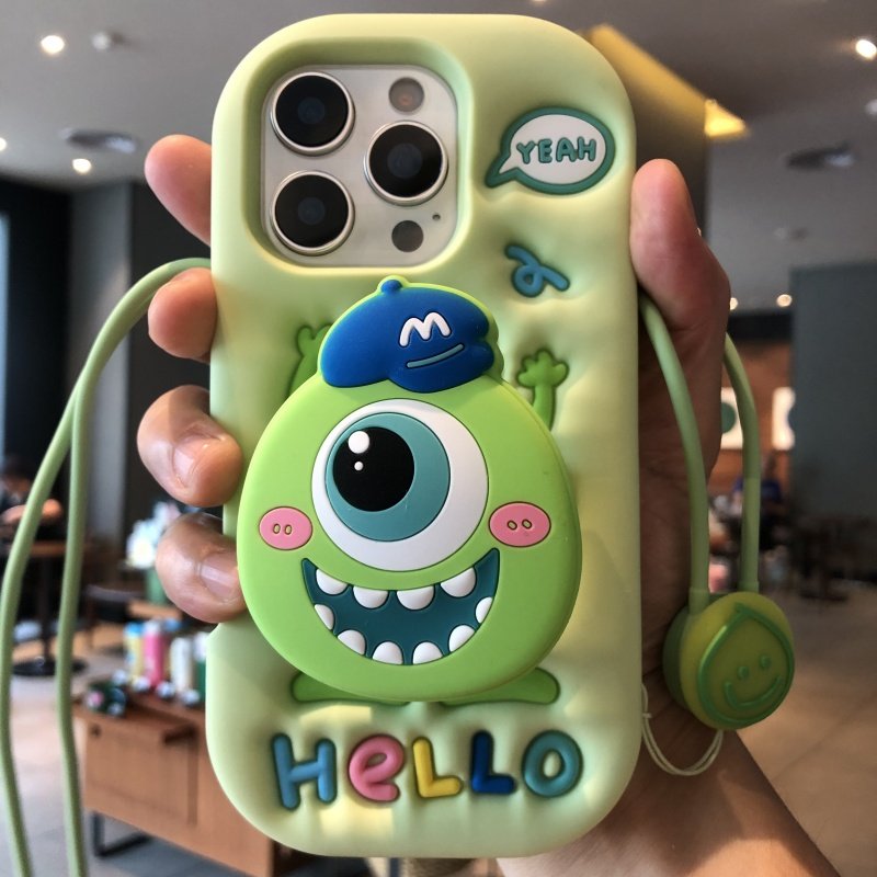 立体绿色大眼仔伸缩支架适用iPhone16proMax手机壳苹果15 14 13全包防摔卡通情侣软硅胶保护套挂绳女