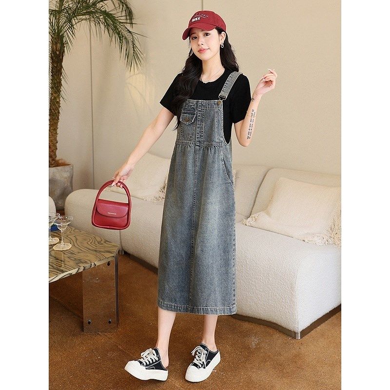 2025中长裙新款加大码百搭宽松收腰背带长裙牛仔吊带a字连衣裙潮