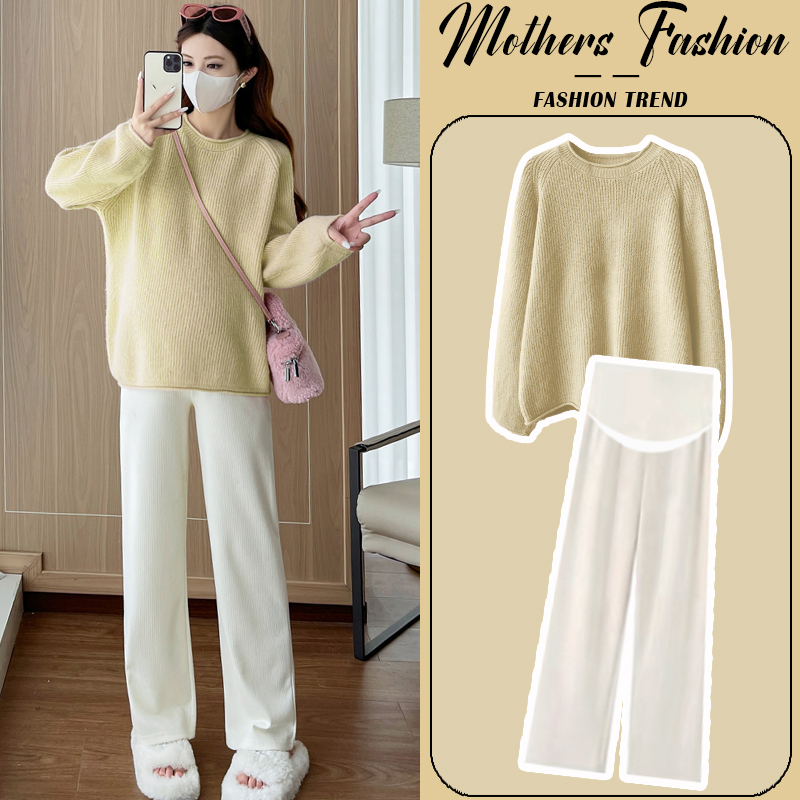 孕妇黄绿色套装秋冬2025新款时尚遮肚针织毛衣百搭上衣裤子两件套