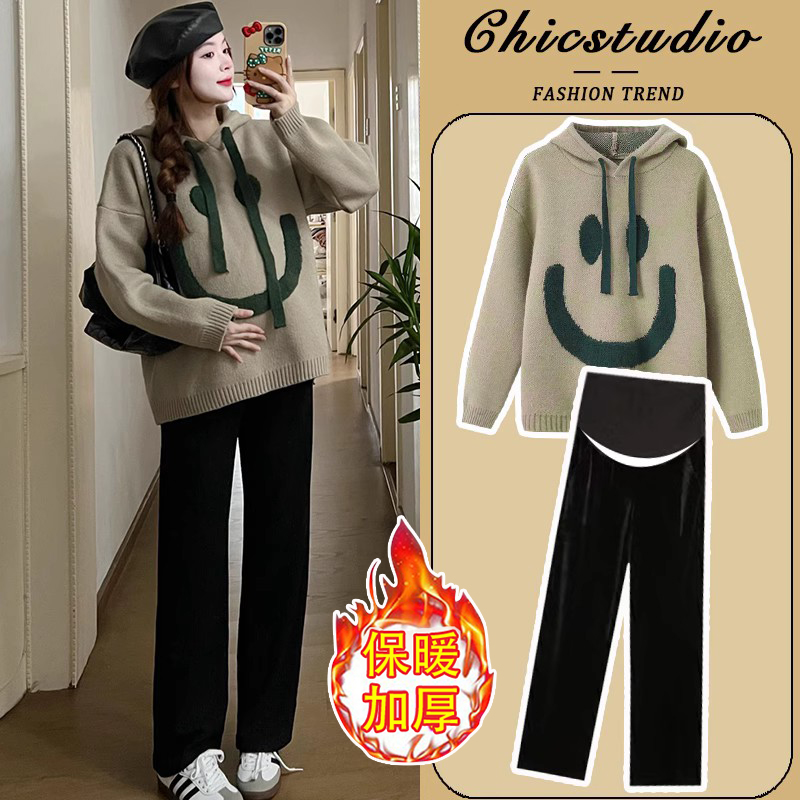 孕妇套装秋冬2025新款黑色宽松时尚毛衣休闲针织连帽上衣两件套女