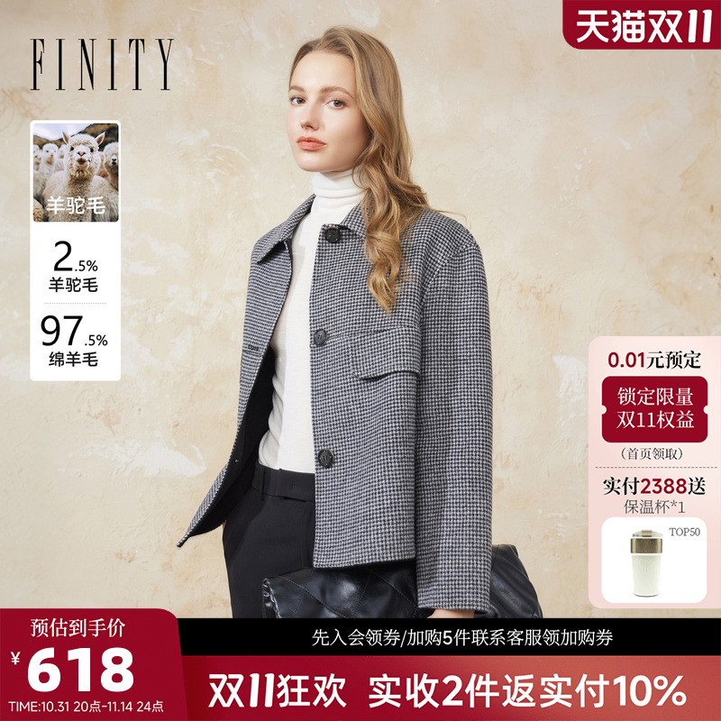 FINITY菲妮迪羊毛复古双面呢大衣女2024年冬季新款千鸟格毛呢外套