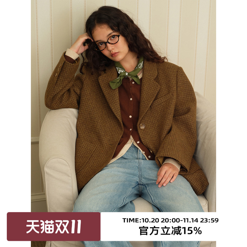 omont蛋挞家复古千鸟格毛呢西装外套2025秋季学院风宽松休闲西服