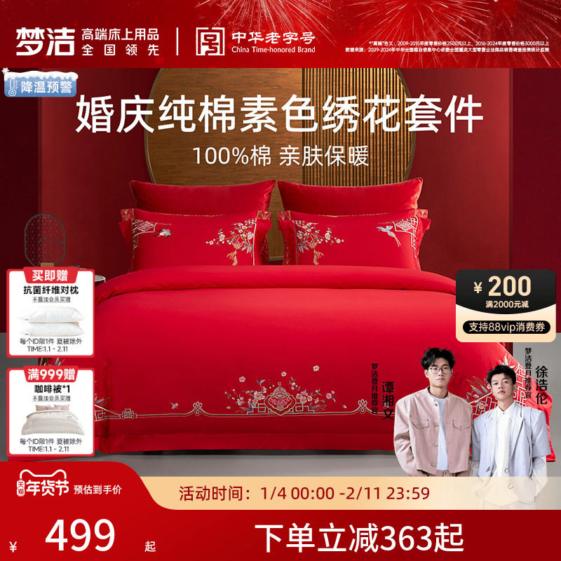 梦洁家纺婚庆四件套全棉纯棉大红色刺绣新婚结婚床单被套床上用品
