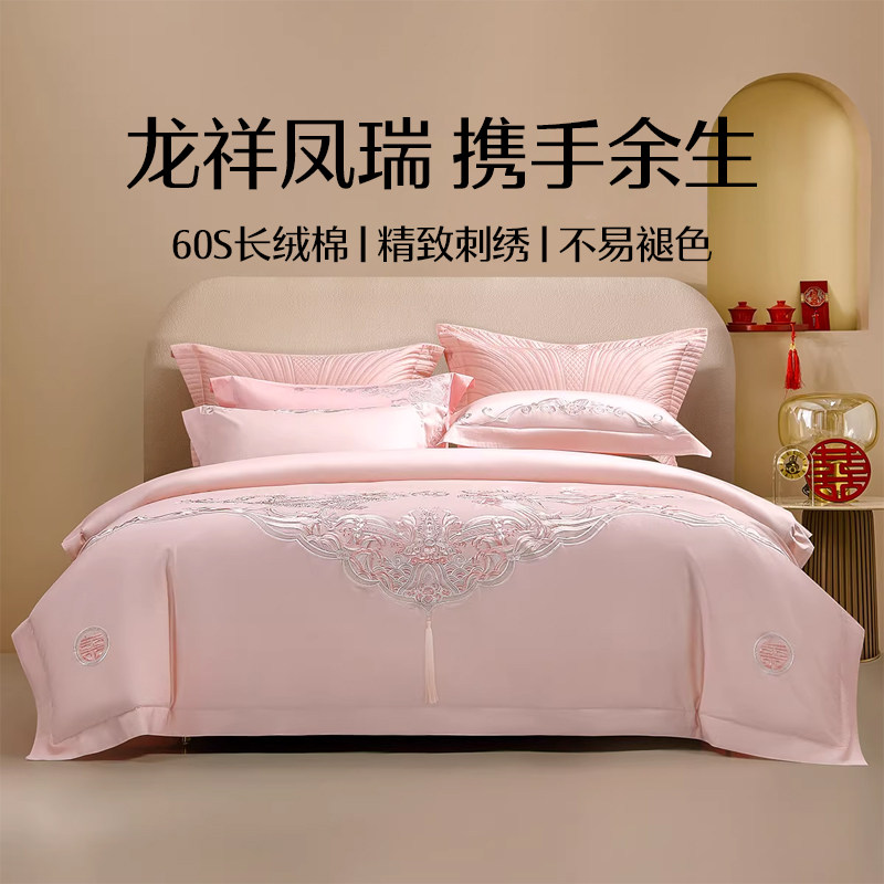 新婚庆四件套大红全棉刺绣结婚房嫁喜被龙凤纯棉六十件套床上用品