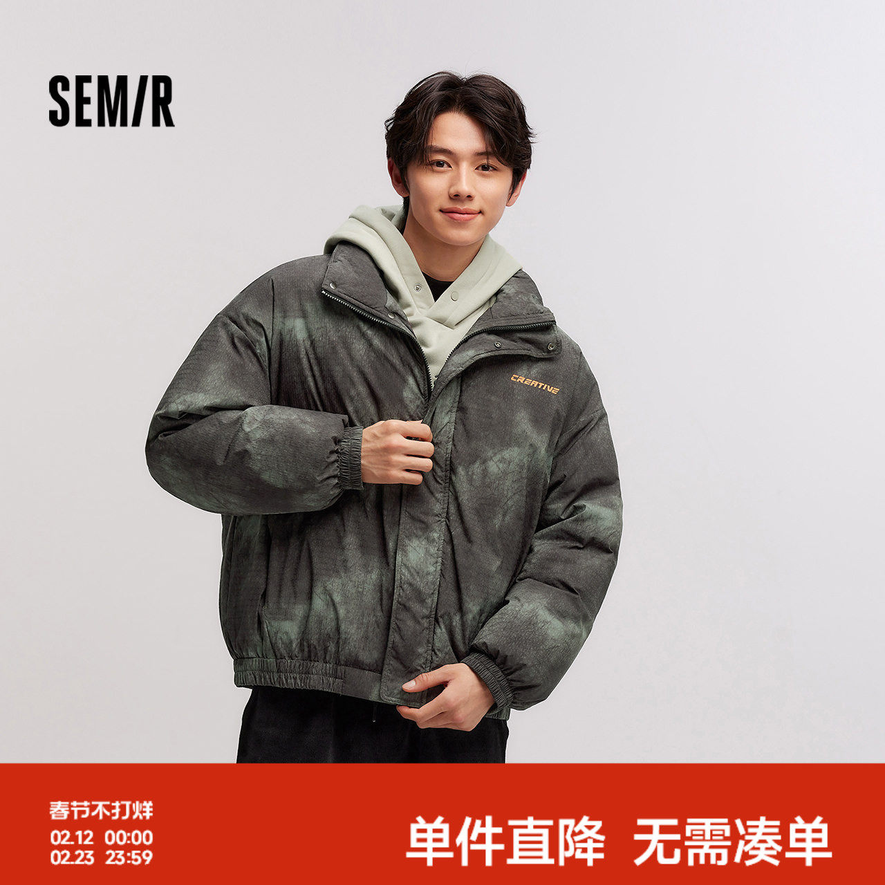 森马羽绒服男冬装80绒子宽松连帽外套肌理感街头潮流字母印花上衣