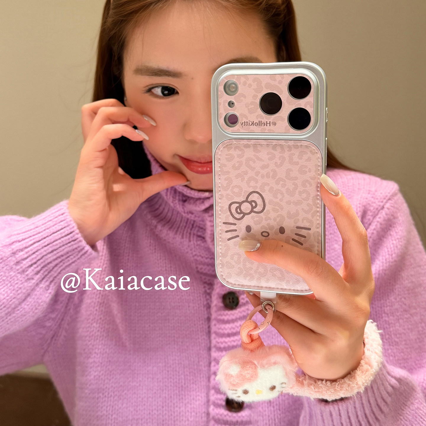 新款黑皮凯蒂猫手机壳适用iPhone16Promax镜子支架苹果17系列/15plus豹纹13/12带化妆镜ip14Pro/16plus女款补