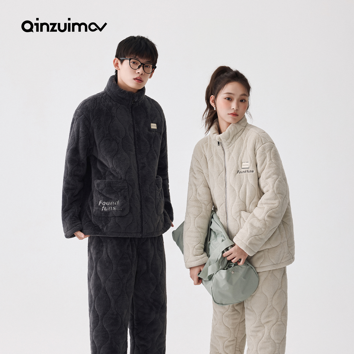 2024冬季新款三层加厚米粒绒男女士夹棉高领拉链保暖情侣睡衣套装