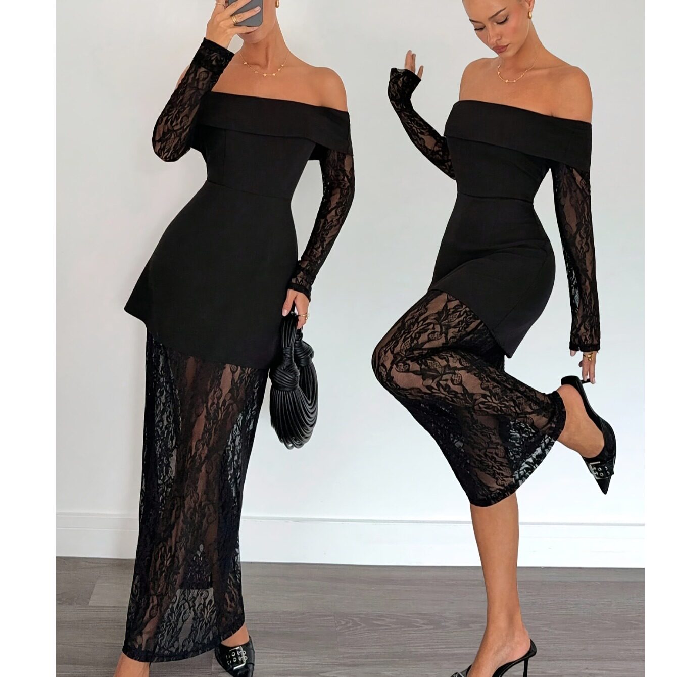 欧美性感露肩一字领黑色蕾丝拼接收腰显瘦透视长袖蕾丝裙晚宴礼服