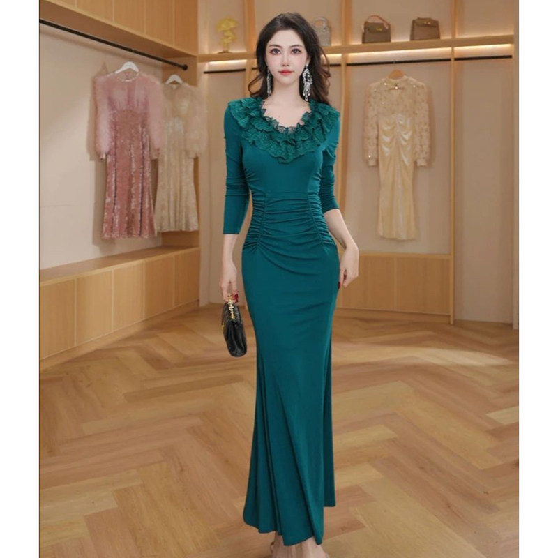 晚礼服2026秋季新品时尚气质修身圆领长袖连衣裙性感宴会拖地长裙