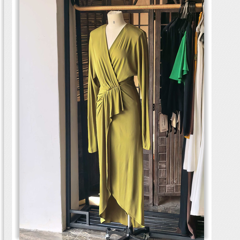 路家尾货绿色连衣裙 V领优雅礼服前开叉性感堆堆长袖高个子拖地