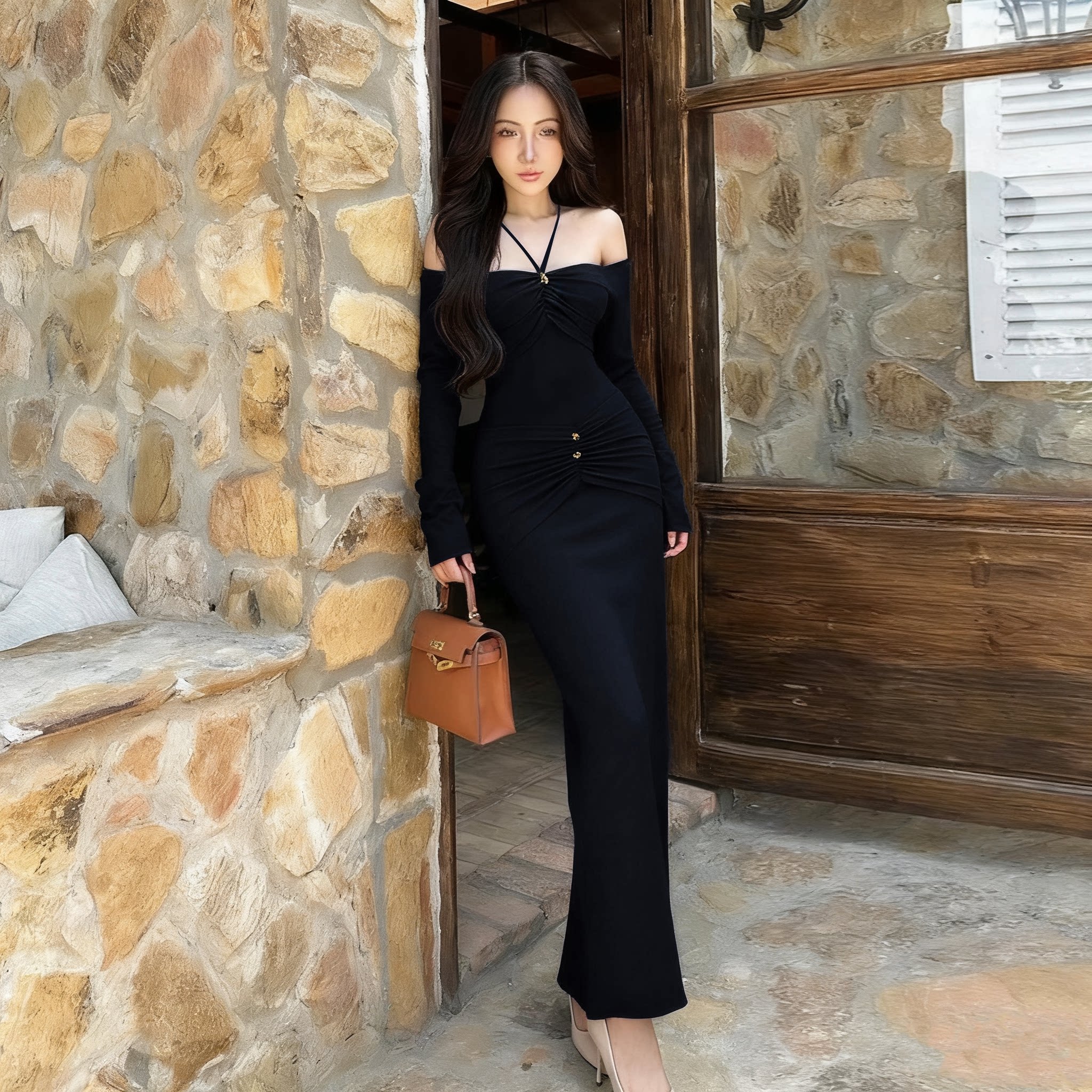 AM NANA轻熟风性感吊带露肩连衣裙气质长袖仙女礼服收腰优雅长裙
