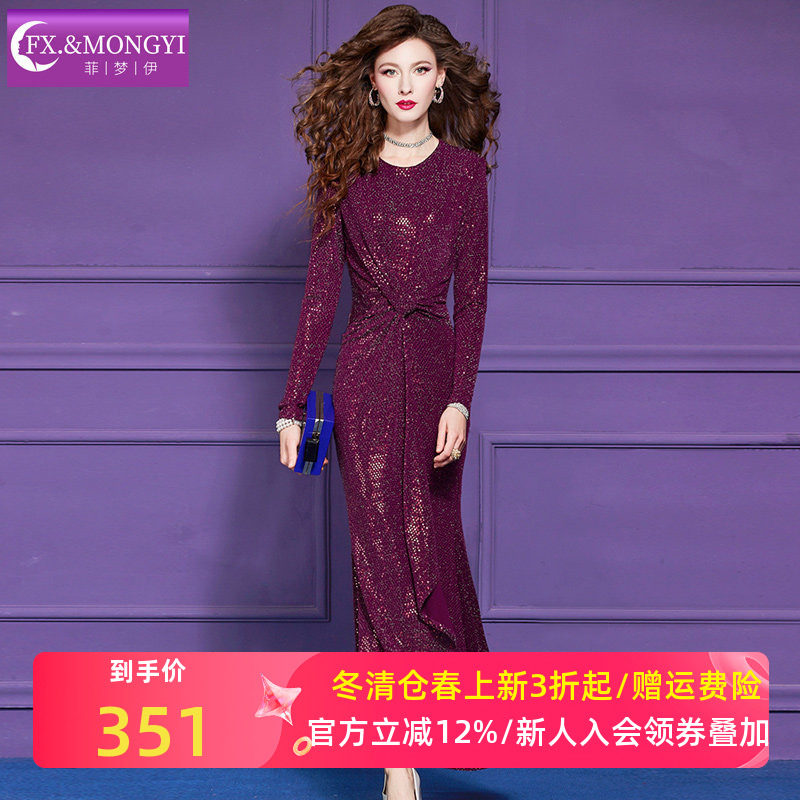 菲梦伊亮片紫色连衣裙女长袖春季轻熟高级性感褶皱收腰礼服长裙子
