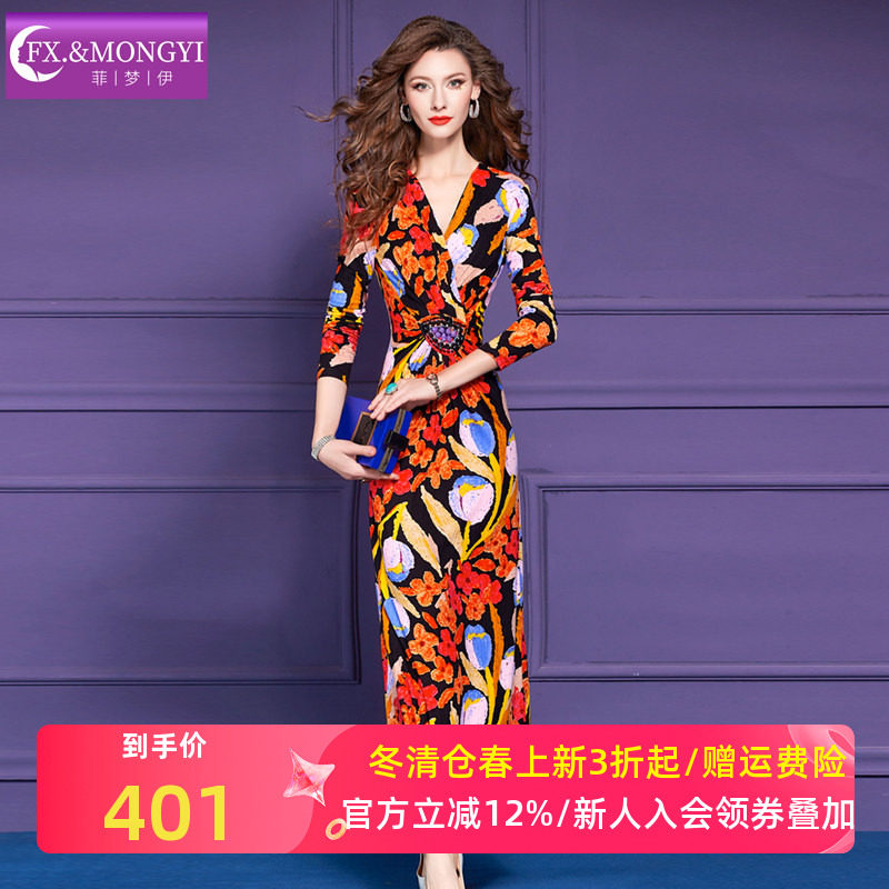 菲梦伊印花连衣裙女长袖秋装复古设计感收腰性感V领打底长裙礼服