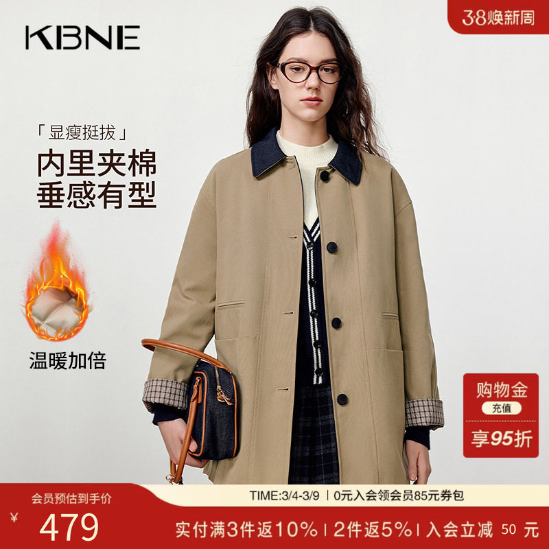 KBNE宽松中长款卡其色风衣女2025冬季新款高级感休闲夹棉风衣外套