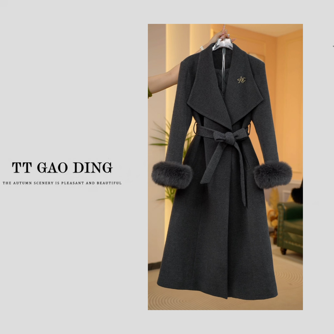 2025黑/金系列冬季中长款毛呢外套女狐狸毛袖口宽松鹅绒羽绒大衣