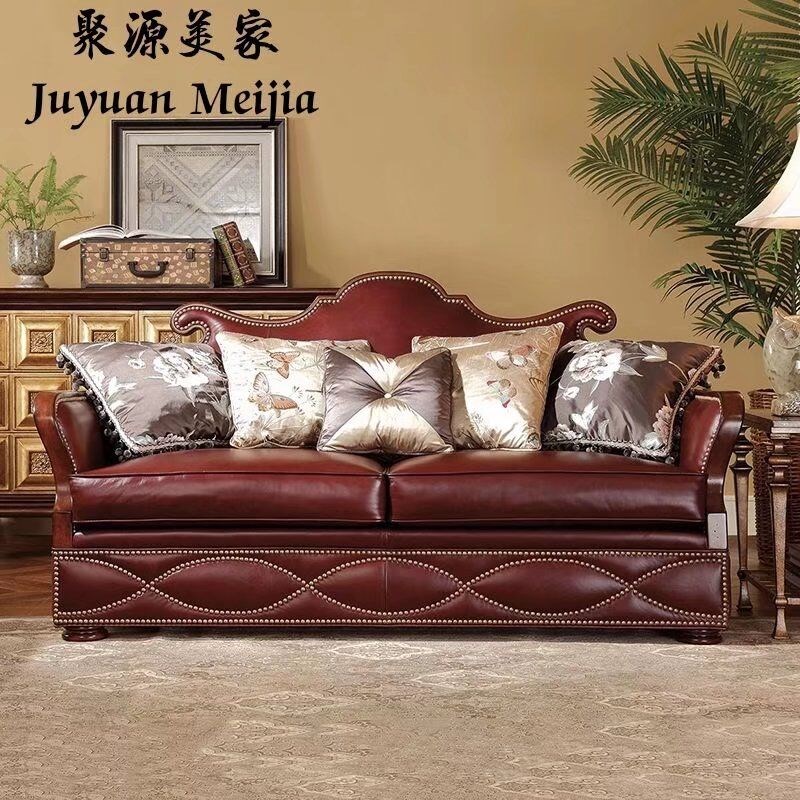 欧式真皮沙发美式复古实木头层牛皮中古风小户型123组合三人沙发