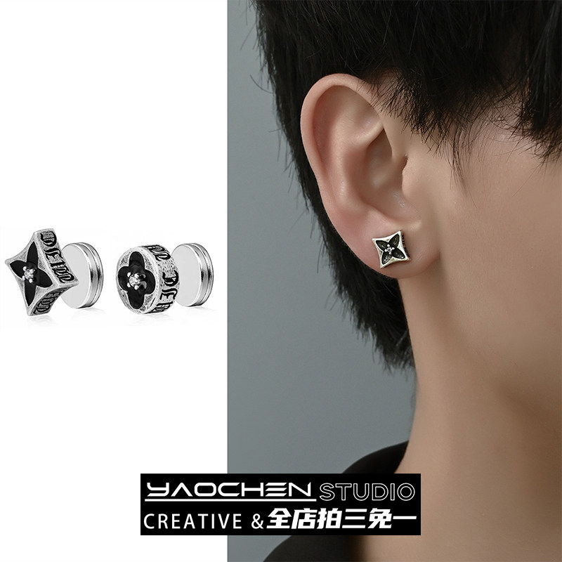 磁吸复古四叶草耳夹无耳洞男款潮流黑色耳环男士耳骨钉痞帅风耳饰