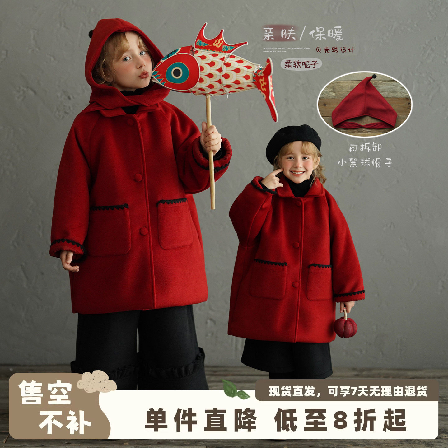 大小卷女童毛呢外套冬装2025新款儿童加厚红色女孩新年呢子大衣