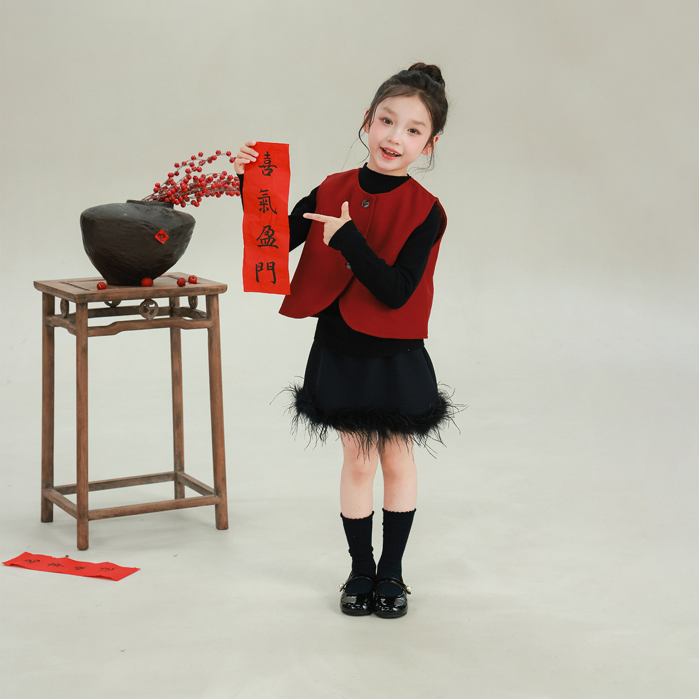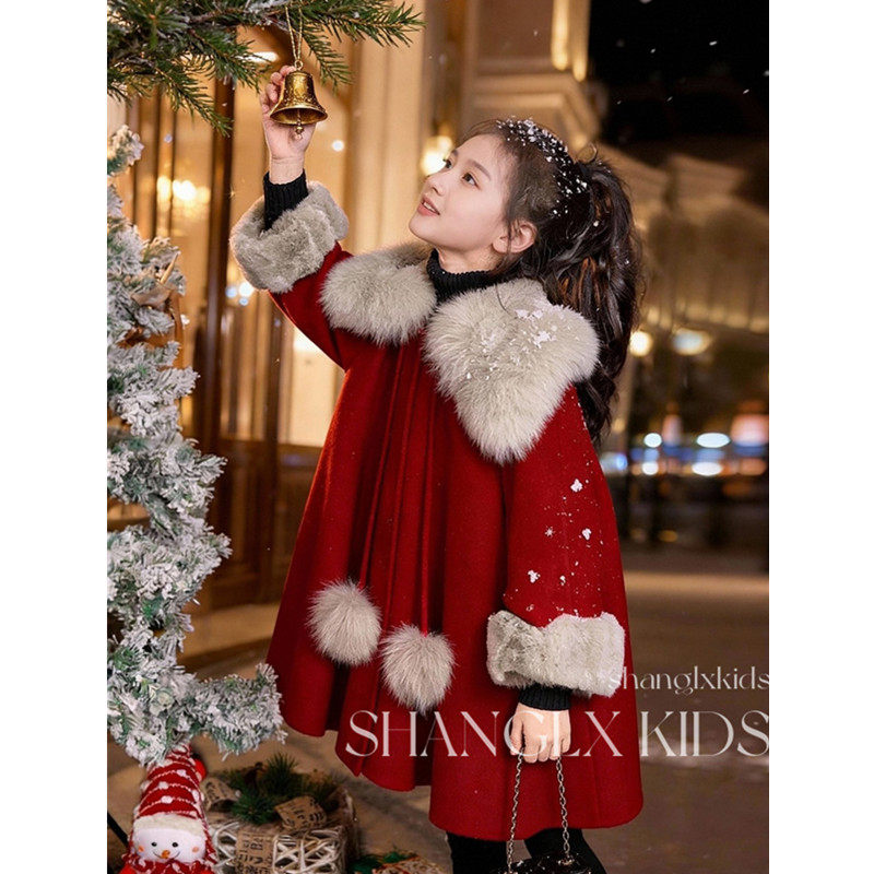 女童毛呢洋气外套冬2025新款女孩本命年中长款大衣儿童红色拜年服