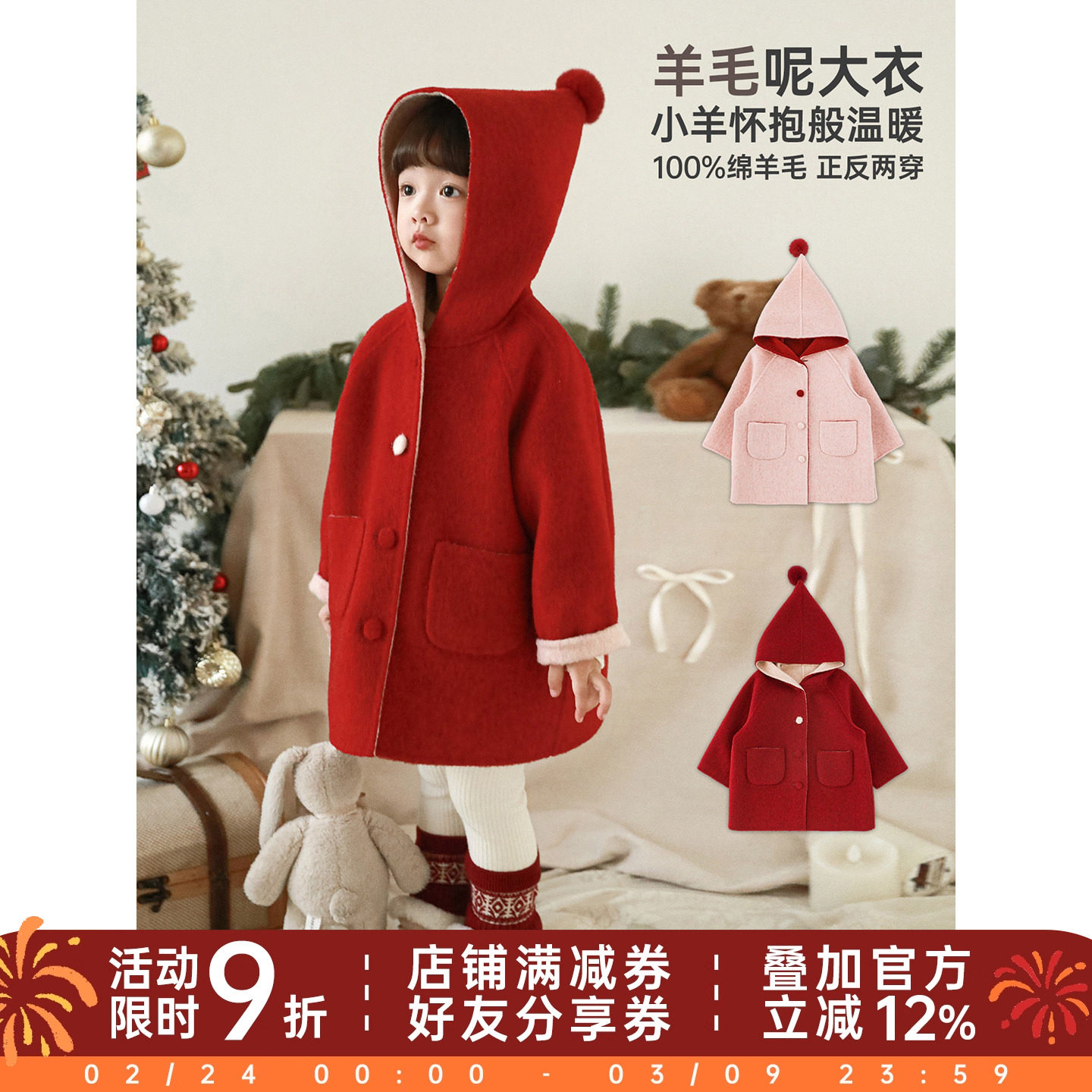 幼悠女童2025冬季新款正反两穿羊毛呢大衣连帽保暖外套女孩拜年服