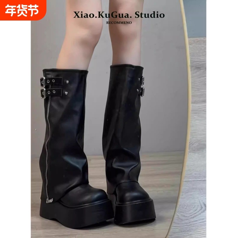 显瘦裤管靴女2024新款夏季厚底增高长筒靴辣妹高筒骑士靴黑色棕色