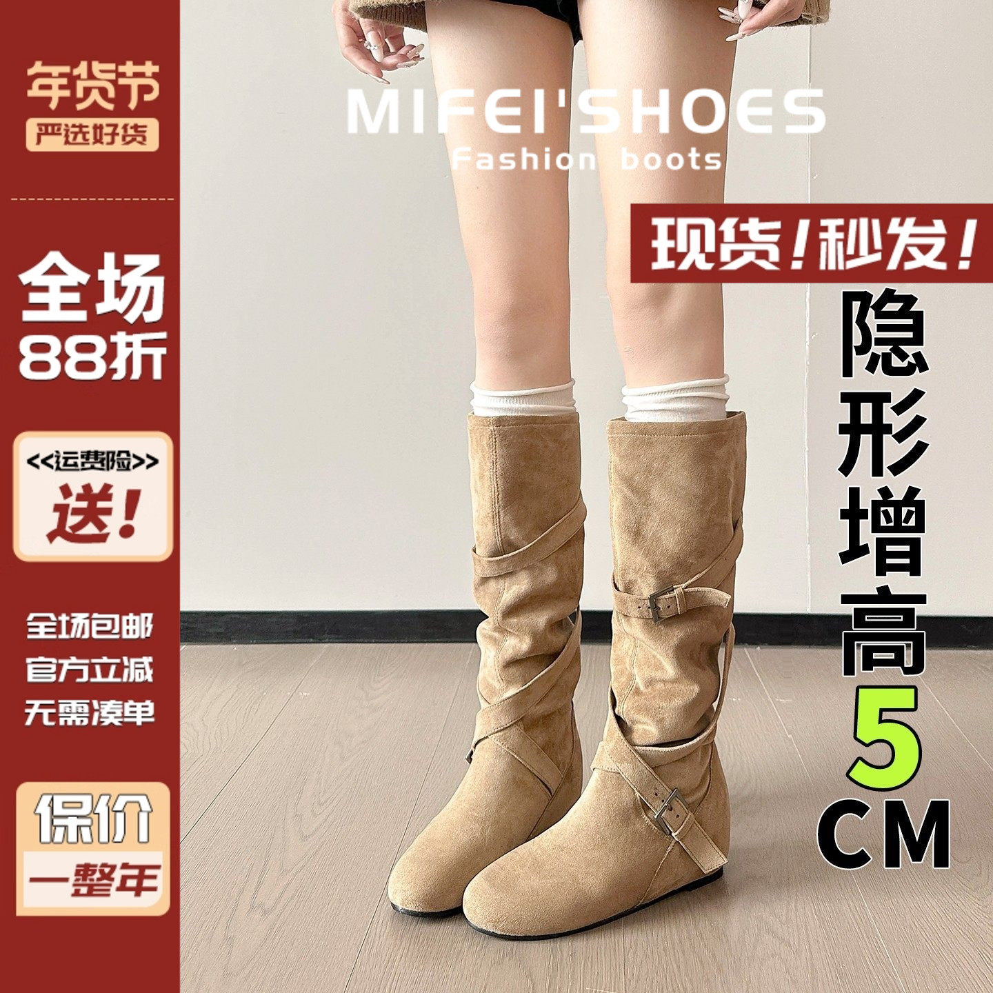 米霏~内增高中高筒堆堆靴女胖mm粗腿显瘦长筒西部牛仔靴大码长靴