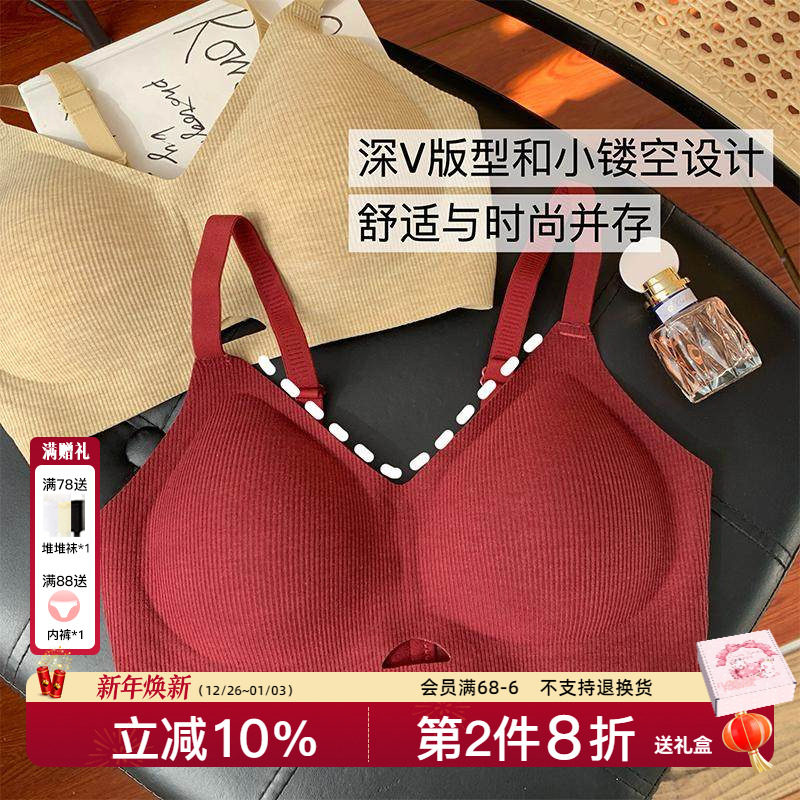 红色本命年无钢圈超聚拢性感深V小胸厚少女士无痕内衣文胸罩套装