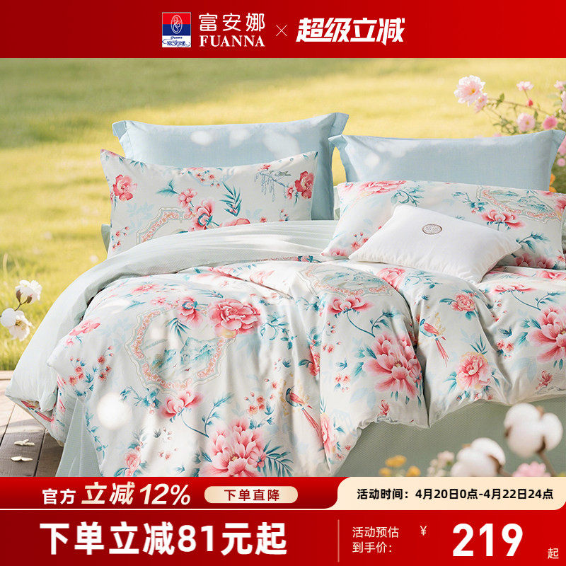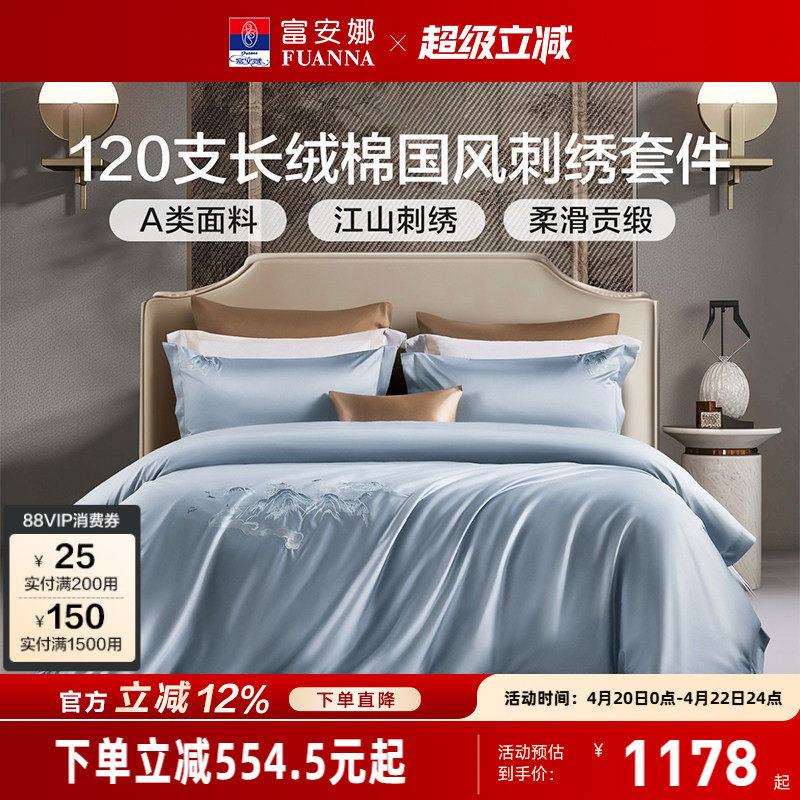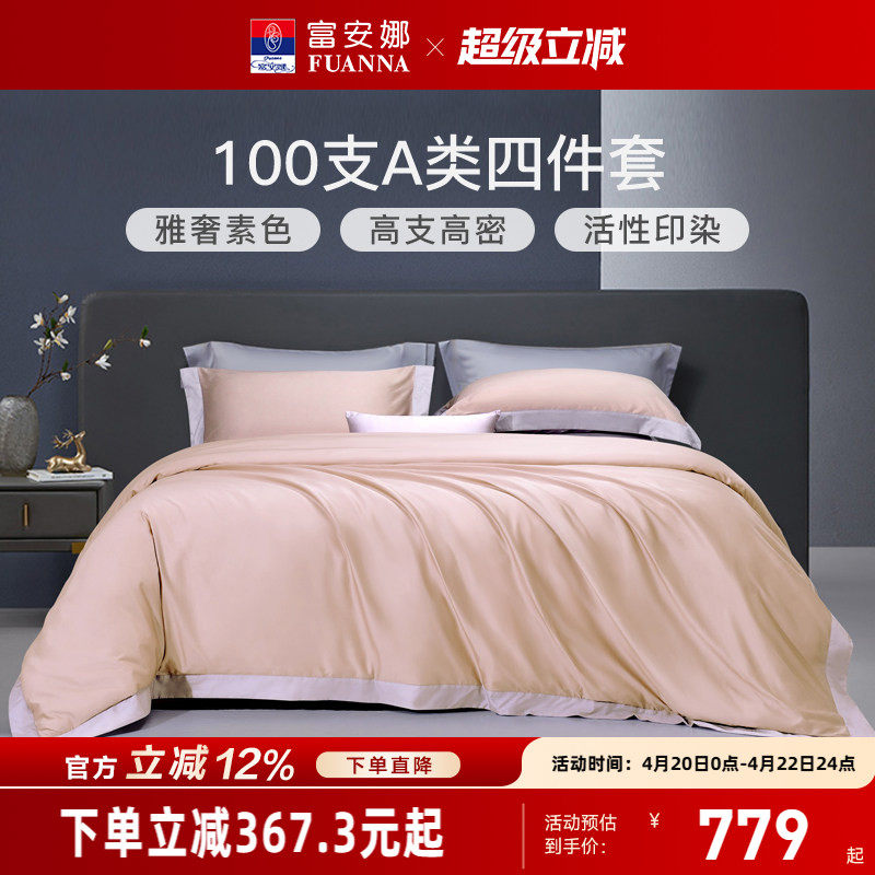 富安娜家纺100支双股长绒棉床上四件套纯棉全棉床单被套轻奢床品