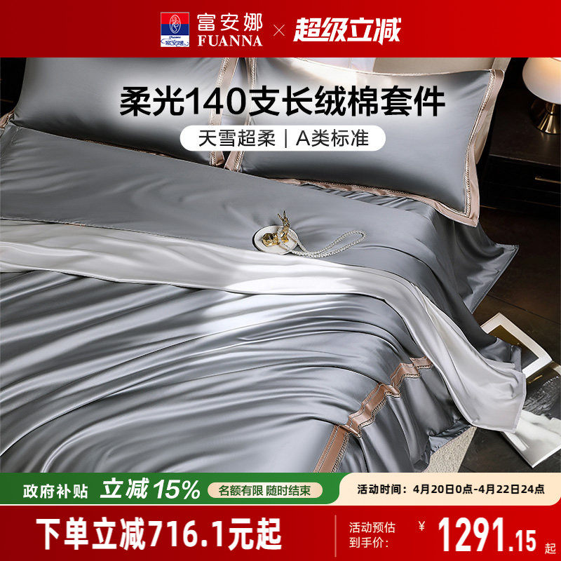 富安娜140支A类长绒棉床上四件套纯棉全棉床单被套贡缎轻奢高级感