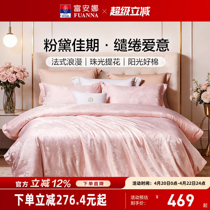 富安娜床上四件套结婚家纺轻奢粉色提花床单纯棉婚嫁新婚婚庆被套