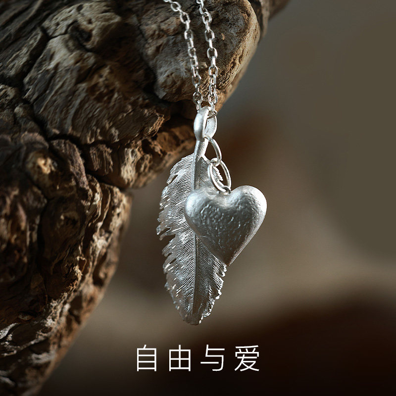 原创羽毛《自由与爱》999纯银男女项链 爱心心形情人节礼物送女友