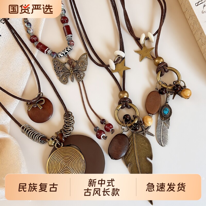 新中式复古长款羽毛项链女民族风高级装饰毛衣链波西米亚吊坠配饰