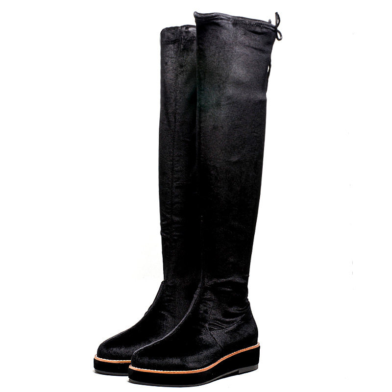 丝绒过膝长靴子女冬黑色天鹅绒布圆头厚底水台低跟松糕DF64116001